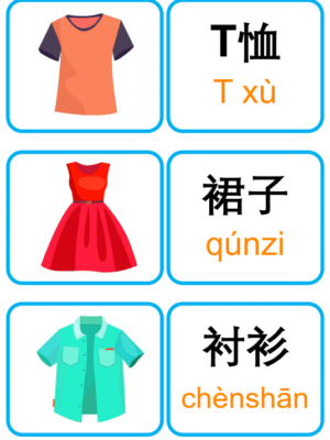 Bộ thẻ flashcard tiếng Trung chủ đề quần áo, thời trang và phụ kiện, bao gồm các từ vựng với chữ Hán giản thể, pinyin kèm thanh điệu, giúp ghi nhớ hiệu quả. Thích hợp cho việc giảng dạy từ vựng, trang trí lớp học, hoạt động ghép đôi, trò chơi nhóm, hoặc trưng bày sinh động trên tường lớp!