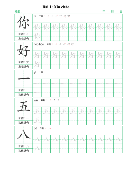 Tập viết chữ Hán theo Giáo trình Hán ngữ 1- 6 Phiên bản 3 giúp bạn viết đúng nét – nhớ lâu – học chắc từ ngày đầu!